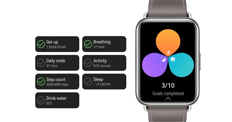 Estos beneficios podemos encontrarlos en los smartwatches de Huawei, como el WatchFit 2. A este reloj se le pueden activar recordatorios de la hora de dormir, de levantarse, de la hidratación y de la actividad física, así como de las tareas diarias personalizadas, que pueden configurarse en la aplicación Huawei Salud.