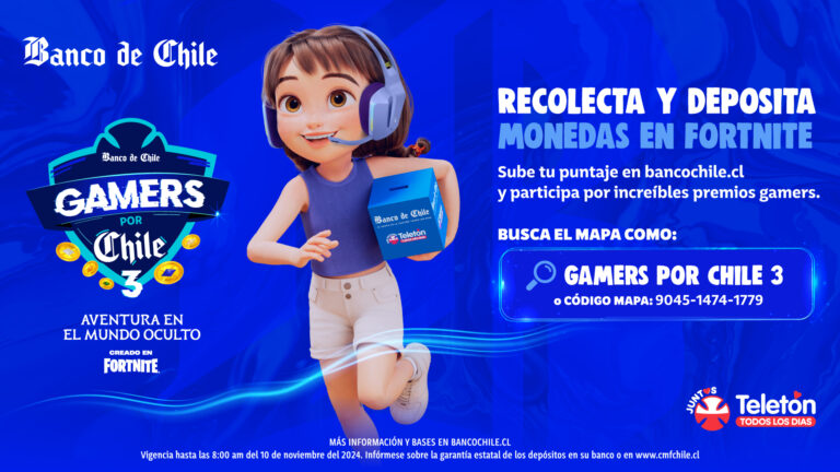 Los próximos 8 y 9 de noviembre Chile se une nuevamente para ir en ayuda de la Teletón. Para acercarse a los más jóvenes e invitarlos a ser parte de esta noble causa, Banco de Chile lanza la tercera versión de Gamers por Chile, su nueva propuesta en el popular videojuego Fortnite.