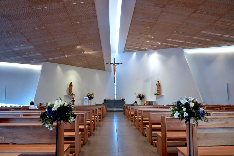 Desde la concepción del proyecto arquitectónico, se buscó que el interior del templo fuese lo más limpio posible, con pocos elementos más allá de las figuras religiosas, el mobiliario y objetos propios del altar. Y de hecho, una de las solicitudes específicas fue que no se colocaran altavoces en la zona del presbiterio, el área en que se ubica el altar y en donde el sacerdote lleva a cabo las celebraciones.