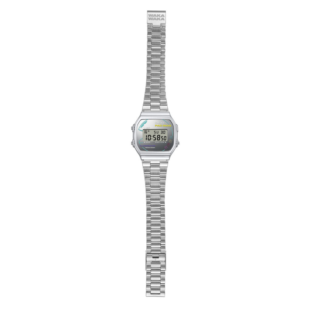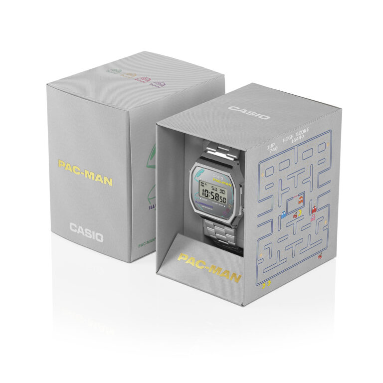 Los modelos A168WEPC y F-91WPC incorporan a PAC-MAN y los cuatro FANTASMAS (Blinky, Inky, Clyde y Pinky) en un diseño atrevido con una paleta de colores neón vibrantes, otorgándole un estilo pop. El característico sonido que PAC-MAN hace al comer puntos — ‘WAKA WAKA’ — está impreso en la cubierta del cierre del A168WEPC y se muestra en la pantalla LCD cuando se ilumina. Además, está presente en el sujetador de la banda del F-91WPC, añadiendo un toque distintivo.