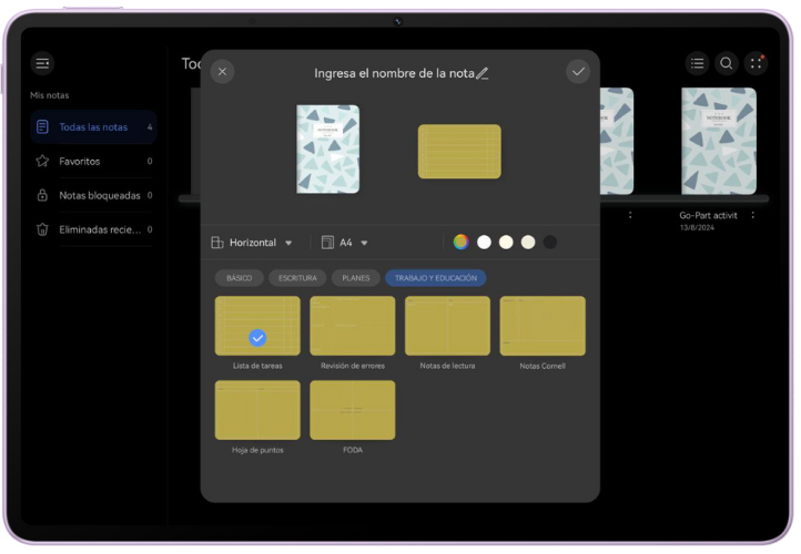 - Plantillas para casi todo: HUAWEI Notas ofrece una gran variedad de plantillas, incluidos diseños orientados al trabajo y el colegio, para listas de tareas, actas de reunión, gestión de tiempo, planes semanales y mensuales, escritura a mano, pentagramas musicales y mucho más. También puedes cambiar la alineación de la plantilla en horizontal o vertical, y hasta seleccionar el formato de tamaño y color de la plantilla.