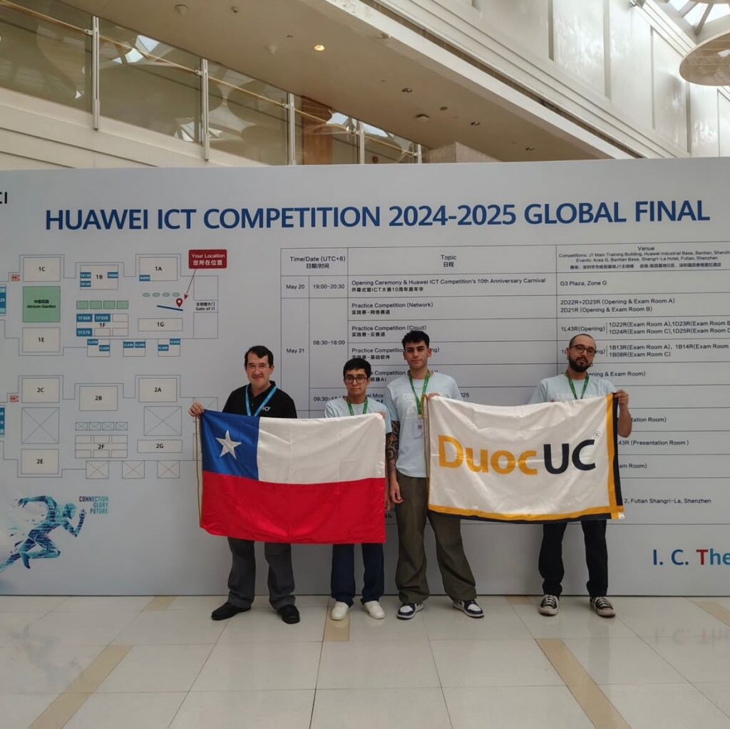 El pasado sábado 24 de mayo se llevó a cabo la Final Global de la ICT Competition Huawei en Shenzhen (China), competencia internacional organizada por la empresa tecnológica china donde estudiantes chilenos de Duoc UC se llevaron el segundo lugar en la categoría de Networking (Redes).
