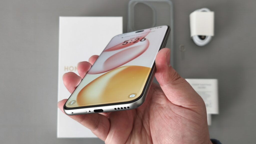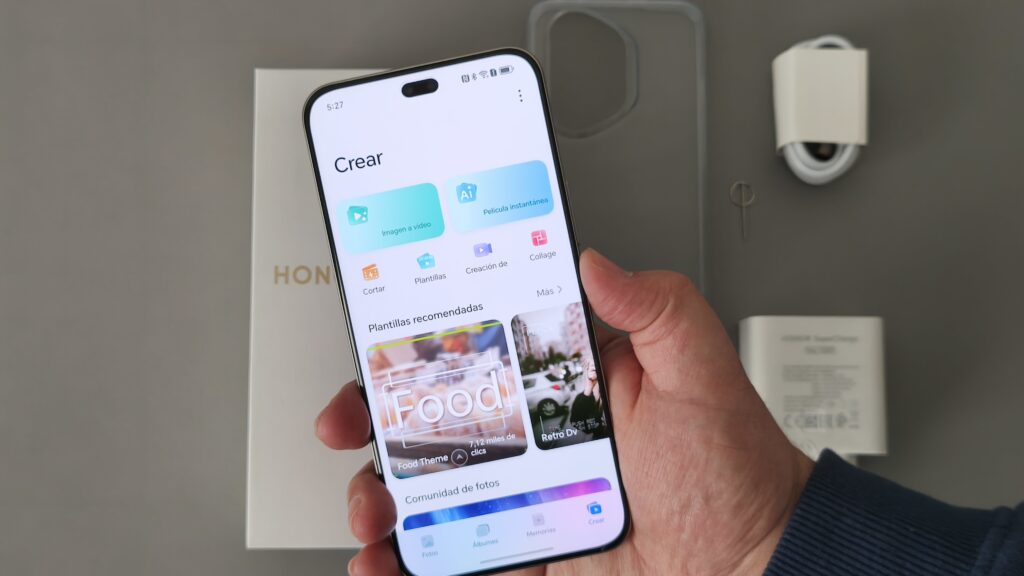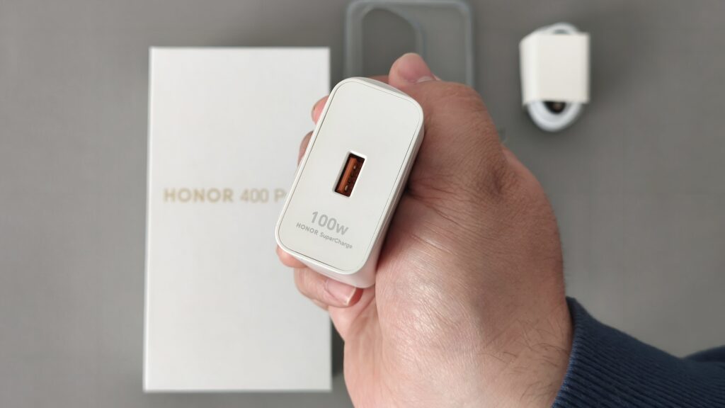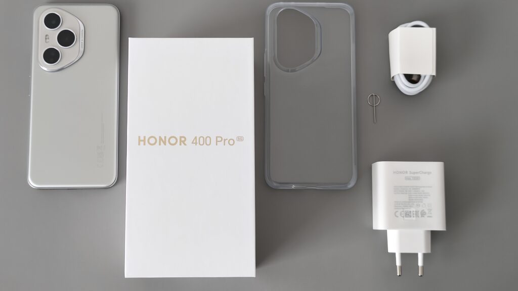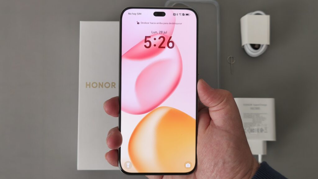 Al abrir la caja del HONOR 400 Pro, nos encontramos con un empaque bien organizado que refleja la atención al detalle de la marca. Junto al smartphone se incluye, una funda protectora transparente de silicona, un cargador HONOR SuperCharge de 100 W, un cable USB-C, una herramienta para extracción de la bandeja SIM y la documentación habitual (guía rápida y tarjeta de garantía). Esta presentación asegura que el usuario cuente con todo lo necesario para comenzar a utilizar el dispositivo desde el primer momento, sin necesidad de adquirir accesorios adicionales.