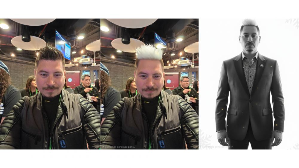 Foto 1 Original, imagen tomada con Galaxy Z Fold7, Foto 2 Edición con Galaxy AI, se cambia el color de cabello, Foto 3 Resultado final luego de haber ingresado el prompt a Gemini Pro