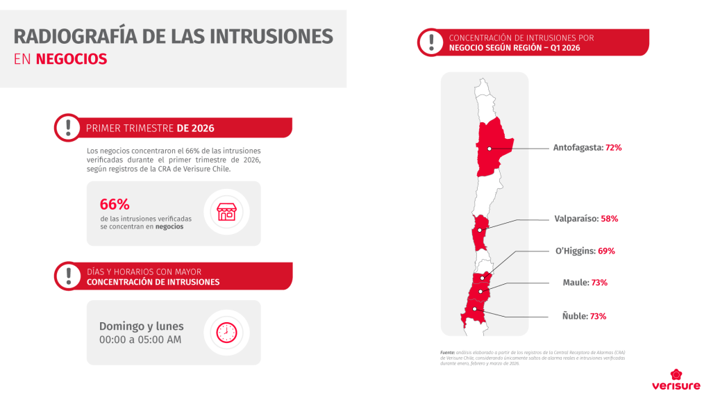 Información a nivel Regional: A nivel regional, la mayor concentración de intrusiones en negocios durante el primer trimestre de 2026 se observó en Maule, con un 73%; Antofagasta, con un 72%; O’Higgins, con un 69%; Ñuble, con un 65%; y Valparaíso, con un 58%.